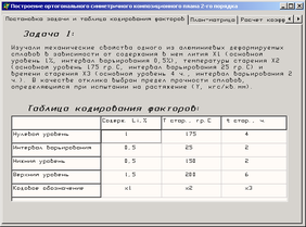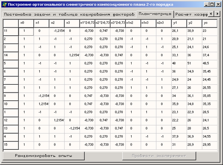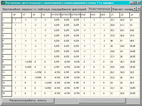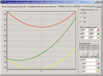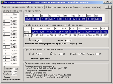 Классы решаемых задач: анализ и статистическая обработка полнофакторного эксперимента с ортогональными планами второго порядка, в которую входят нахождение коэффициентов регрессии, оценка из значимости, проверка адекватности и воспроизводимости модели; поиск сочетаний факторов в кодовых и натуральных переменных; построения графиков отклика от изменения каждого параметра; построения кривых равного выхода при фиксировании одного из параметров.