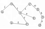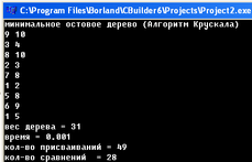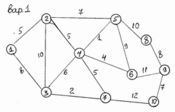 for (i = 0;i { min = inf; for (j = 0;j< n;j++) if ((v[j]!=1) && (d[j] < min)) { sr_count++; min = d[j]; pr_count++; k = j; pr_count++; } printf("%d %d\n",k+1, p[k]+1); mst_weight+=a[k][p[k]]; v[k] = 1; for (j = 0;j< n;j++) if ((v[j]!=1) && (d[j] > a[k][j])) { sr_count++; p[j] = k; pr_count++; d[j] = a[k][j]; pr_count++; } } } Результат роботи програми: Алгоритм Крускала Алгоритм Крускала спочатку поміщає кожну вершину в своє дерево, а потім поступово об'єднує ці дерева, об'єднуючи на кожній ітерації два деяких дерева деяким руба. Перед початком виконання алгоритму, усі ребра сортуються за вагою (в порядку неубиванія). Потім починається процес об'єднання: перебираються всі ребра від першого до останнього (у порядку сортування), і якщо у поточного ребра його кінці належать різним піддерев, то ці піддерев об'єднуються, а ребро додається до відповіді. Після закінчення перебору всіх ребер всі вершини опиняться належать одному піддереві, і відповідь знайдений. Сортування ребер потребують O (M log N) операцій. Приналежність вершини того чи іншого піддереві зберігається просто за допомогою масиву, об'єднання двох дерев здійснюється за O (N) простим проходом по масиву. Враховуючи, що всього операцій об'єднання буде N-1, ми й отримуємо асимптотики O (M log N + N2). Покращена реалізація використовує структуру даних "Система непересічних множин" позволет домогтися асимптотики O (M log N). Так само, як і в простій версії алгоритму Крускала, відсортуємо усі ребра по неубиванію ваги. Потім помістимо кожну вершину в своє дерево (тобто своє безліч) на це піде в сумі O (N). Перебираємо усі ребра (у порядку сортування) і для кожного ребра за O (1) визначаємо, чи належать його кінці різних деревам (за допомогою двох викликів FindSet за O (1)). Нарешті, об'єднання двох дерев буде здійснюватися викликом Union - також за O (1). Разом ми отримуємо асимптотики O (M log N + N + M) = O (M log N). void kruskal() { int k, i, p, q; pr_count=0; sr_count=0; q_sort(1, m); // сортируем список ребер по неубыванию for (i = 0;i< n;i++) // цикл по вершинам { r[i] = i; // у вершина своя компонента связности s[i] = 0; // размер компоненты связности } k = 0; // номер первого ребра + 1 for (i = 0;i< n-1;i++) // цикл по ребрам mst { do { // ищем ребра из разных k++; // компонент связности p = a[k].x; pr_count++; q = a[k].y; pr_count++; while (r[p]!=p) // ищем корень для p // { sr_count++; p = r[p]; pr_count++; } while (r[q]!=q) // ищем корень для q } { sr_count++; q = r[q]; pr_count++; } }while (p==q); printf("%d %d\n",a[k].x, a[k].y); // вывод ребра mst_weight+=a[k].w; if (s[p] < s[q]) // взвешенное объединение { // компоненты связности r[p] = q; pr_count++; s[q] = s[q] + s[p]; pr_count++; } else { r[q] = p; pr_count++; s[p] = s[p] + s[q]; pr_count++; } } } Результат роботи програми: В результаті виконання програм ми переконалися, що вони дають однакове мінімальне остове дерево, яке має вигляд: Висновок. Якщо кількість вершин достатньо мала, то доцільніше використовувати алгоритм Прима, в іншому випадку доцільно користуватися алгоритмом Крускала. Код програм Алгоритм Прима. #include #include #include #include const int maxn = 100, inf = MAXINT/2, Max = 10000; int a[maxn][maxn], p[maxn], z; int v[maxn]; int d[maxn], n, mst_weight, pr_count, sr_count; clock_t start, end; void init() { int i, j, x, y, nn, z; FILE *f; mst_weight = 0; for (i = 0;i for (j = 0;j a[i][j] = inf; for (i =0;i< maxn; i++) { v[i]=0; d[i]=0; p[i]=0; } f=fopen("input.txt","rt"); fscanf(f,"%d",&n); fscanf(f,"%d",&nn); for (i = 0;i< nn;i++) { fscanf(f,"%d %d %d",&x, &y, &z); a[x-1][y-1] = z; a[y-1][x-1] = z; // если неориентированный граф } fclose(f); } void prim() { } int main() { clrscr(); init(); printf("Min ostove derevo (by Prim)\n"); start= clock(); prim(); end= clock(); printf("Vaga dereva = %d\n", mst_weight); printf("Time = %f\n", (end-start)/CLK_TCK); printf("Comparison = %d\n", pr_count); printf("Assignment = %d \n", sr_count); getch(); return 0; } //--------------------------------------------------------------------------- Алгоритм Крускала. //--------------------------------------------------------------------------- #include #pragma hdrstop //--------------------------------------------------------------------------- #prag