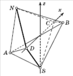 B уходит вверх (вниз), но вообще направления их движений зависят от конкретных длин рёбер. Рассмотрим движения точки N более подробно, для чего введём следующую систему координат: направим ось Ox вдоль прямой DC, от D к C, плоскость SDC примем за плоскость xOz, направив ось Oz вверх, начало координат поместим в середине отрезка DC (см. рис. 25). Пусть длина ребра DC равна 2a, длина SD=SC=b