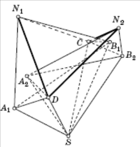 Зафиксируем некоторые положения точек N1 и N2, симметричные относительно неподвижной плоскости DSC и склеим (отождествим) в этом положении рёбра SD и SC из первой «зарубки» с такими же рёбрами из второй «зарубки». Получится многогранник M, изображённый на рис. 26 и имеющий край N1DN2C.