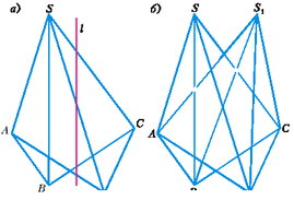 При повороте вокруг оси на 180° четырехгранный угол SABCD переходит в конгруэнтный угол SXCDAB (рис. 21 б). Совокупность 8 треугольников удовлетворяет всем трем условиям в определении многогранника. Правда, некоторые грани этого многогранника пересекают друг друга.