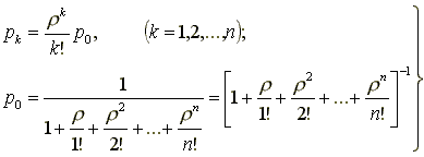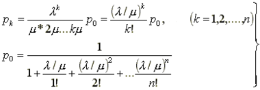 Естественно, нас больше всего будут интересовать предельные вероятности состояний p0 , p1 ,..., pk ,..., pn, характеризующие установившийся режим работы СМО (при t ® ¥). Для нахождения предельных вероятностей воспользуемся уже готовым решением задачи, полученным для схемы гибели и размножения. Согласно этому решению,