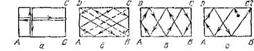 Найпростіші більярдні траєкторії в прямокутнику – періодичні. Вони можуть бути декількох типів: складатися з дворазово пройдених відрізків між протилежними сторонами (малюнок а)); утворювати родини паралелограмів зі сторонами, паралельними діагоналям прямокутника (малюнок б)); утворювати замкнені ламані (малюнок в))