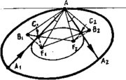 (тільки для каустик-еліпсів) Тут F1 і F2 —фокуси еліпса, а А1АА2 - дві ланки більярдної траєкторії. Точка В1 і В2 симетричні фокусам F1 і F2 відносно прямих А1А і А2А. Добре відомо, що відрізки F1А і F2А утворюють однакові кути з дотичною до еліпса в точці А. Тому всі чотири кути ‹В1АА1, ‹А1АF1 ‹F2AA2 i ‹A2AB2 рівні між собою. Отже, трикутники АВ1F2 і AB2F1 рівні, тобто B1F2=B2F1. Звідсіля |F1C1| + |F2C1| = |F1C2| + |F2C2|, де С1 і С2 – точки перетину АА1 з В1F2 i AA2 з B2F1.Значить, С1 і С2 лежать на одному еліпсі з фокусами F1 і F2, для якого відрізки АА1 і АА2 є дотичними. До речі, каустики є і у більярда в колі – це концентричні кола меншого радіусу.