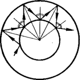 раєкторії типу «б» трохи складніше, ніж типу «а», але і у них кути падіння на зовнішнє коло однакові. І на внутрішню — теж, що видно з мал.