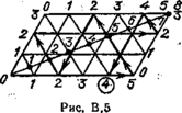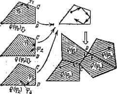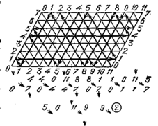 (π-β)/2 (π- α)/2 Задачі на побудову траєкторій в многокутниках зводимо до побудови обмоток. Перш за все опишемо ще один подход до більярдів, що дає можливість будувати пучки - з перескакуванням. Хай Q — фіксований многокутник. Виберемо на площині напрям відліку кутів—скажімо, задаватимемо напрям v на Q кутом φ, відлічуваним від напряму сторони АВ многокутника Q проти годинникової стрілки до напряму v. Кут φ вимірятимемо в радіанах, причому так, що 0<φ<2п . Для кожного числа φ між 0 і 2π готуємо свій екземпляр багатокутника Q, на якому намалюємо пучок паралельних траєкторій з напрямом φ. Цей багатокутник Q з намальованими на ньому траєкторіями позначимо Q(φ) таким чином, ми «запасли» нескінченний набір екземплярів Q(φ) многокутника Q. Наклавши їх один на одного в порядку зростання. ф, отримаємо призму висоти 2я, в підставі якій лежить багатокутник Q. Розглянемо кулю, що «скаче» з одного многокутника на інші многокутники за наступним правилом. Якщо в початковий момент часу куля знаходилася на багатокутнику Q(φ1), то він рухається по своїй траєкторії до тих пір, поки не потрапить на одну із сторін, скажемо CD. Якби куля була більярдна, то він відскочив би від сторони CD за законом пружного віддзеркалення і став би рухатися під новим напрямом φ2. Наша ж кулька, що скаче, перескакує з боку CD многокутника Q(φ1) в ту ж точку тієї ж сторони CD іншого многокутника Q(φ2) , де φ2 було визначене вище із закону пружного віддзеркалення, і рухається по намальованій на Q(φ2) траєкторії, Дійшовши до сторони KL багатокутника Q(φ2) , кулька перескакує в ту ж крапку на тій же стороні KL наступного многокутника Q(φ3), де φ3 — напрям, під яким рухається більярдний шар після зіткнення із стороною КL, налетівши на неї під напрямом φ2. І так далі як зображено на малюнку. Якщо накласти всі ці багатокутники один на одного, то відрізки траєкторії, що скаче, дадуть траєкторію більярда в багатокутнику Q. Многокутники Q, всі кути яких вимірні з π називаються раціональними. Більярд в будь-якому раціональному многокутнику зводиться до обмоток кренделя – сфери з ручками, який отримується в результаті вищеописаних склейок. На кренделі бувають неперіодичні траєкторії і заповнюється всюди щільно лише частина кренделя. (Доведення основане на теоремі Якобі). Доведена теорема, що в будь-якому раціональному многокутнику існують періодичні траєкторії. Тепер перейдемо до наступного розділу курсової роботи, де продемонстровано, як викладені теоретичні відомості застосовуються на практиці. Практичне застосування теорії математичних більярдів Ось деякі олімпіадні задачі, що дуже витончено розв’язуються за допомогою «більярдів». Мова йде про «переливання», які, здавалось би, не мають нічого спільного з більярдами. Є два сосуди ємкістю 7 і 11 літрів і велика бочка, що наповнена водою. Як за допомогою цих двох сосудів відміряти рівно два літри? На сосудах не можна робити засічок, не можна нахиляти, щоб відміряти долі літра. Запропонована задача вирішується або алгебраїчним методом, або методом спроб та помилок. Цю задачу можна з легкістю розв’язати, викресливши більярдну траєкторію кулі, що відбивається від бортів ромбічного столу. Межі таких столів зручніше за все малювати на папері, на якому нанесена гратка з однакових рівносторонніх трикутників. В наведеній задачі сторони столу мають бути завдовжки 7 і 11 о