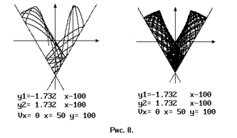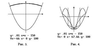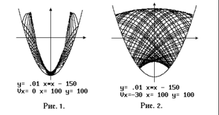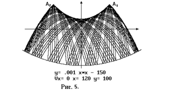 , з початковою швидкістю, рівною нулю. Таке ж сімейство кривих виходить для випадків руху тіл, кинутих "під кутом до горизонту", якщо перший удар об стінку буде справа. В осоружному випадку, траєкторії матимуть інший вигляд - мал. 3, які вироджуються у відрізок параболи, якщо перший удар відбувається під кутом 90 0 . На цих малюнках чітко видні "заборонені зони".