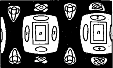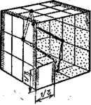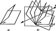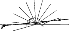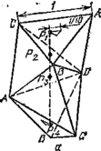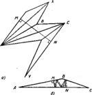 Більярд в двогранному куті. Також просто виходить відповідь на питання про число віддзеркалень променя світла в дзеркалі, що має форму двогранного кута в просторі (мал. а). Величину його плоского кута позначимо α. Зробивши декілька віддзеркалень відносно граней цього кута, отримаємо «книжку», «листи» якої перетинає випрямлена траєкторія (мал. б). Зрозуміло, що число цих «листів» обчислюється по тій же формулі Nα = — [—π/α], оскільки проекція більярдної траєкторії γ на площину δ, перпендикулярну «корінцю» книжки (тобто загальному ребру всіх «листів»), дає знову більярдну траєкторію в плоскому куті величиною α.