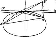 Вписаний трикутник АВС найбільшого периметру. Проведемо дотичну D'D'' в точці С і доведемо, що ‹АС D'' = ‹ВС D'. Тоді ‹АСС'>‹ВСС'. Для точки В', симетричної В відносно прямої СС', ламана АС'В' містить ламану АСВ' і тому довше, ніж вона.