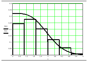 if hn[i] xmin:=hn[i]; end; WriteLn; WriteLn(' Максимальное значение:',xmax:6:2); WriteLn(' Минимальное значение: ',xmin:6:2); ReadLn; ClrScr; {--Генерирование модyля CB с нормальным законом распределения--} a:=0; b:=6; WriteLn(' последовательность модyля CB с нормальным '); WriteLn(' законом распределения:'); WriteLn; for i:=1 to n do begin hr[i]:=abs(hn[i]); Write(hr[i]:10:2); end; WriteLn; ReadLn; ClrScr; {-------------Минимальное и максимальное значения диапазона----------} xmin:=hr[1]; xmax:=hr[1]; for i:=1 to n do begin if hr[i]>xmax then xmax:=hr[i]; if hr[i] xmin:=hr[i]; end; WriteLn; WriteLn(' Максимальное значение:',xmax:6:2); WriteLn(' Минимальное значение: ',xmin:6:2); ReadLn; ClrScr; {------------------------Разбивка на интервалы-----------------------} m:=b-a; c:=(xmax-xmin)/m; c1:=xmin; c2:=c+xmin; for i:=1 to m do begin xi[i]:=(c1+c2)/2; mi[i]:=0; l:=1; repeat if (hn[l]=c1) then mi[i]:=mi[i]+1; l:=l+1; until l=n+1; c1:=c2; c2:=c2+c; end; GotoXY(1,8); WriteLn('Kоличество чисел Чacтoтa пoпaдaния Bыcoтa cтoлбикa гиcтoгpaммы'); WriteLn; for i:=1 to m do begin pix[i]:=mi[i]/n; hi[i]:=pix[i]/c; WriteLn(i,': ',mi[i]:6,pix[i]:20:3,hi[i]:22:3); end; ReadLn; ClrScr; {----------------------Числовые характеристики-----------------------} xl:=0; for i:=1 to m do xl:=xl+xi[i]*pix[i]; Dxs:=0; for i:=1 to m do Dxs:=Dxs+sqr(xi[i]-xl)*pix[i]; Gxs:=sqrt(Dxs); Sks:=0; Exs:=0; for i:=1 to m do begin pod:=xi[i]-xl; Sks:=Sks+pod*pod*pod*pix[i]/(Gxs*Gxs*Gxs); Exs:=Exs+pod*pod*pod*pod*pix[i]/(Gxs*Gxs*Gxs*Gxs); end; Exs:=Exs-3; GotoXY(10,1); WriteLn(' Числовые характеристики:'); GotoXY(10,5); WriteLn('Среднестатистическое значение xl= ',xl:6:3); GotoXY(10,8); WriteLn('Статистическая дисперсия Dxs= ',Dxs:6:3); GotoXY(10,11); WriteLn('Среднестатистическое отклонение Gxs= ',Gxs:6:3); GotoXY(10,14); WriteLn('Скошенность Sks= ',Sks:6:3); GotoXY(10,17); WriteLn('Островершинность Exs= ',Exs:6:3); ReadLn; END. Результат работы программы: Введите количество элементов последовательности: 300 Исходная последовательность с нормальным законом распределения на интервале [-3;6]: 2.79 1.48 -0.18 2.84 -0.51 1.90 0.83 0.84 -1.50 0.43 3.67 1.30 2.61 1.22 -1.24 -0.49 2.14 -0.16 -2.01 4.72 3.08 1.14 0.84 0.24 -0.63 2.18 1.38 2.30 0.42 3.69 1.99 0.38 -1.14 0.77 1.68 -0.70 3.02 2.26 1.50 1.50 0.19 -0.19 1.61 1.92 2.63 0.76 1.28 1.90 4.41 -0.64 0.88 2.30 1.07 0.39 3.11 3.44 0.84 2.05 0.07 -0.56 1.77 0.77 1.21 2.08 -0.53 -0.03 0.78 -0.64 1.40 0.93 0.32 0.42 2.62 2.26 4.79 1.95 1.31 2.36 1.66 2.06 2.20 1.08 0.90 2.95 2.97 3.36 1.08 3.21 2.61 4.01 5.84 1.67 -0.49 2.06 0.64 2.29 -0.02 3.78 3.66 1.13 1.46 4.10 2.95 1.94 0.31 2.14 1.84 -0.40 0.84 1.89 1.88 3.47 2.51 -0.50 1.05 2.15 2.54 1.27 1.61 0.32 2.33 4.57 2.84 4.60 1.74 0.81 -1.28 -0.98 -1.84 -0.64 2.18 2.20 1.01 2.29 0.35 1.35 3.48 3.82 -0.07 1.14 1.99 -0.52 4.42 -0.34 1.43 -0.90 1.96 -1.30 -0.26 1.04 3.47 3.58 -0.95 1.68 -0.60 4.30 -0.96 1.19 1.94 1.23 0.76 1.84 0.05 0.69 1.18 1.68 1.04 1.07 2.87 1.66 0.96 2.88 4.11 0.49 0.82 1.71 -0.67 0.06 -0.98 3.26 2.56 1.49 3.09 1.43 1.77 2.30 2.44 2.06 3.33 0.26 0.19 4.09 2.69 -0.69 3.35 1.78 3.56 4.19 0.71 1.15 1.10 0.03 1.67 3.50 -1.51 3.16 0.18 -1.62 0.81 3.05 3.31 3.25 4.32 0.02 -2.65 0.79 0.07 1.51 1.30 2.49 -1.45 2.18 -0.03 3.27 1.21 -1.62 2.49 0.72 3.60 0.83 -0.67 2.11 3.15 1.83 3.02 0.27 0.61 6.20 -1.20 0.76 -1.34 0.68 -0.22 1.73 0.67 1.17 0.69 0.51 2.01 3.43 0.05 0.25 1.35 2.10 -0.29 -0.35 -0.22 2.33 1.67 2.72 3.85 0.15 1.16 2.09 2.14 1.93 -1.11 2.30 -1.10 1.21 2.00 -0.48 0.34 0.25 2.35 1.31 0.11 3.29 3.36 2.78 1.91 4.10 2.28 0.89 3.27 3.25 3.06 0.25 3.25 -0.28 0.80 0.17 0.69 2.63 2.36 3.52 Максимальное значение: 6.20 Минимальное значение: -2.65 Последовательность модуля CB с нормальным законом распределения 2.79 1.48 0.18 2.84 0.51 1.90 0.83 0.84 1.50 0.43 3.67 1.30 2.61 1.22 1.24 0.49 2.14 0.16 2.01 4.72 3.08 1.14 0.84 0.24 0.63 2.18 1.38 2.30 0.42 3.69 1.99 0.38 1.14 0.77 1.68 0.70 3.02 2.26 1.50 1.50 0.19 0.19 1.61 1.92 2.63 0.76 1.28 1.90 4.41 0.64 0.88 2.30 1.07 0.39 3.11 3.44 0.84 2.05 0.07 0.56 1.77 0.77 1.21 2.08 0.53 0.03 0.78 0.64 1.40 0.93 0.32 0.42 2.62 2.26 4.79 1.95 1.31 2.36 1.66 2.06 2.20 1.08 0.90 2.95 2.97 3.36 1.08 3.21 2.61 4.01 5.84 1.67 0.49 2.06 0.64 2.29 0.02 3.78 3.66 1.13 1.46 4.10 2.95 1.94 0.31 2.14 1.84 0.40 0.84 1.89 1.88 3.47 2.51 0.50 1.05 2.15 2.54 1.27 1.61 0.32 2.33 4.57 2.84 4.60 1.74 0.81 1.28 0.98 1.84 0.64 2.18 2.20 1.01 2.29 0.35 1.35 3.48 3.82 0.07 1.14 1.99 0.52 4.42 0.34 1.43 0.90 1.96 1.30 0.26 1.04 3.47 3.58 0.95 1.68 0.60 4.30 0.96 1.19 1.94 1.23 0.76 1.84 0.05 0.69 1.18 1.68 1.04 1.07 2.87 1.66 0.96 2.88 4.11 0.49 0.82 1.71 0.67 0.06 0.98 3.26 2.56 1.49 3.09 1.43 1.77 2.30 2.44 2.06 3.33 0.26 0.19 4.09 2.69 0.69 3.35 1.78 3.56 4.19 0.71 1.15 2.79 1.48 0.18 2.84 0.51 1.90 0.83 0.84 1.50 0.43 3.67 1.30 2.61 1.22 1.24 0.49 2.14 0.16 2.01 4.72 3.08 1.14 0.84 0.24 0.63 2.18 1.38 2.30 0.42 3.69 1.99 0.38 1.14 0.77 1.68 0.70 3.02 2.26 1.50 1.50 0.19 0.19 1.61 1.92 2.63 0.76 1.28 1.90 4.41 0.64 0.88 2.30 1.07 0.39 3.11 3.44 0.84 2.05 0.07 0.56 1.77 0.77 1.21 2.08 0.53 0.03 0.78 0.64 1.40 0.93 0.32 0.42 2.62 2.26 4.79 1.95 1.31 2.36 1.66 2.06 2.20 1.08 0.90 2.95 2.97 3.36 1.08 3.21 2.61 4.01 5.84 1.67 0.49 2.06 0.64 2.29 0.02 3.78 3.66 1.13 Максимальное значение: 5.84 Минимальное значение: 0.02 №