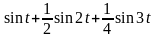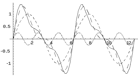 На рисунке мы видим, что график функции полученной в результате сложения трех синусоидальных величин (показан сплошной линией) уже значительно отличается от синусоиды. В большей степени это имеет место для суммы бесконечного ряда величин вида (1).