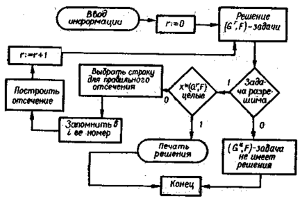 определяет правильное отсечение. Блок-схема второго алгоритма Р. Гомори аналогична блок-схеме первого алгоритма Р. Гомори и отличается лишь правилом построения коэффициентов правильного отсечения.
