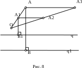– инвариантная прямая всей трансформации (по теореме о неподвижных прямых). Из точек А1 и А2 проведем перпендикуляры на прямую q – А1В1 и А2В2, а из точек А и А3 – на прямую q1 – АВ и А3В3. Тогда АВ и А3В3 – образы отрезков А1В1 и А2В2 при гомотетии