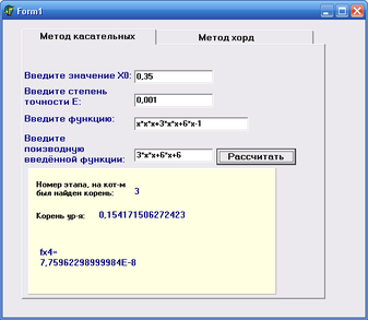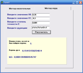 При решении уравнения методом хорд поводится прямая соединяющая концы отрезка [a,b]. Из двух точек А и В выбирается х0. Находится точка пересечения хорды с осью OX. Определяется значение функции в точке пересечения и из найденной точки проводится новая хорда. Этот процесс повторяется до получения необходимой точности.
