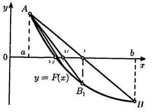 Далее, сравнивая знаки величин F(a) и F(x) для рассматриваемого случая, приходим к выводу, что корень находится в интервале (a, x) , так как F(a)*F(x)<0 (условие существование корня). Отрезок [x , b] отбрасываем и больше не рассматриваем. Следующая итерация состоит в определении нового приближения xn как точки пересечения хорды АВ1 с осью абсцисс и так далее.