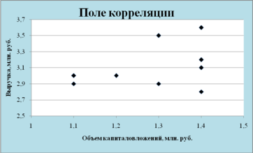 Точки на графике поля корреляции находятся довольно хаотично, что говорит о слабой зависимости объема капиталовложений Х и выручки Y.