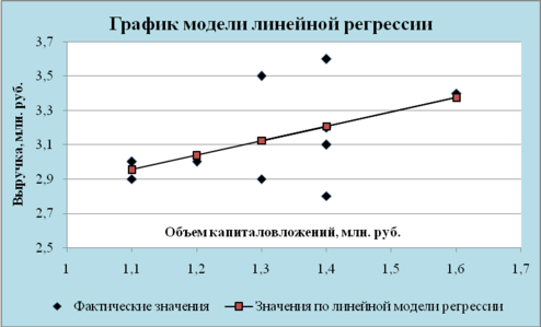 Построена линейная модель зависимости выручки предприятия «АВС» от объема капиталовложений: