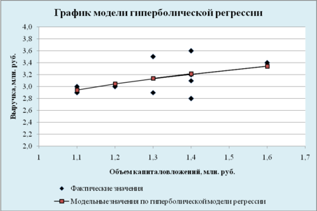 Построена гиперболическая модель зависимости выручки предприятия «АВС» от объема капиталовложений: