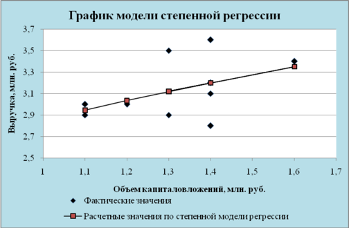Построена степенная модель зависимости выручки предприятия «АВС» от объема капиталовложений: