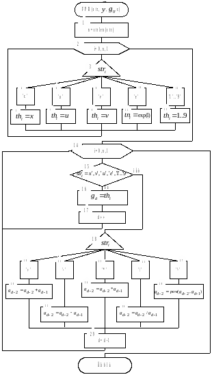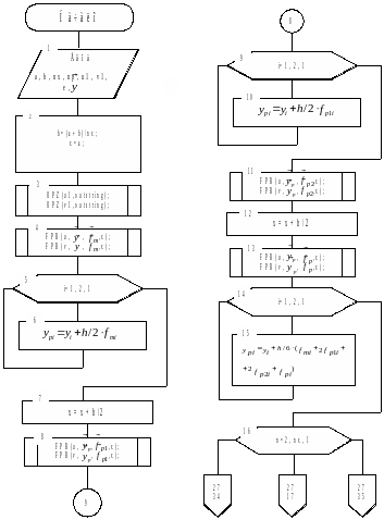 1) Вибираємо в області інтегрування впорядковану систему крапок a=x1 де nx – кількість вузлів заданої сітки. 2) Рішення Для одержання кінцево-різницевої схеми зручно використовувати метод, відповідно до якого необхідно інтегрувати рівняння (2.3) на кожному інтервалі [xk, xk+1] і розділити отримане вираження на довжину цього інтервалу: Далі апроксимуємо інтеграл у правій частині однієї із квадратурних формул і одержуємо систему рівнянь щодо наближених невідомих значень шуканих функцій, які на відміну від точних позначимо ε(h)=|| Відповідно до основної теореми теорії методу сіток (теорема Лакса), для стійкої кінцево-різницевої схеми при прагненні кроку h до нуля погрішність рішення прагне до нуля з тим же порядком, що й погрішність апроксимації: де З0 – константа стійкості, p – порядок апроксимації. Тому для збільшення точності рішення необхідно зменшити крок сітки h. На практиці застосовується множина видів кінцево-різницевих схем, які підрозділяються на одно крокові, багатокрокові схеми й схеми із дробовим кроком. Одно крокові схеми – Метод Ейлера Заміняємо інтеграл у правій частині рівняння (2.5) по формулі лівих прямокутників: Одержимо: де k=0,1,2,…, n. Схема явна стійка. У силу того, що формула для лівих прямокутників має погрішність другого порядку, точність ε(h) першого порядку. – Неявна схема 1-го порядку Використовуючи формулу правих прямокутників, одержимо: Ця схема нерозв'язна в явному виді відносно де s=1,2,… – номер ітерації. Звичайно схема сходиться дуже швидко – 2–3 ітерації. Неявна схема першого порядку ефективніше явної, тому що константа стійкості З0 у неї значно менше. – Метод Ейлера-Коші Обчислення проводяться у два етапи: етап прогнозу й етап корекції. На етапі прогнозу визначається наближене рішення на правому кінці інтервалу по методу Ейлера: На етапі корекції, використовуючи формулу трапецій, уточнюємо значення рішення на правому кінці: Тому що формула трапецій має третій порядок точності, то порядок погрішності апроксимації – дорівнює двом. – Неявна схема 2-го порядки (метод Ейлера-Коші) Використовуючи в (2.5) формулу трапецій, одержимо: Схема не дозволена в явному виді, тому потрібна ітераційна процедура: де s=1,2,… – номер ітерації. Звичайно схема сходиться за 3–4 ітерації. Тому що формула трапецій має третій порядок точності, то погрішність апроксимації – другий. Схеми із дробовим кроком – Схема предиктор-коректор (Рунге-Кутта) 2-го порядки Використовуючи в (2.5) формулу середніх, одержимо: де Потім – Схема Рунге-Кутта 4-го порядку Використовуючи в (2.5) формулу Симпсона, одержимо: Найбільше часто розраховують неявне по Спочатку розраховують предиктор виду: потім коректор по формулі: Оскільки формула Симпсона має п'ятий порядок погрішності, то точність? (h) – четвертого порядку. Багатокрокові схеми Багатокрокові методи рішення задачі Коші характеризуються тим, що рішення в поточному вузлі залежить від даних не в одному попередньому або наступному вузлі сітки, як це має місце в одно крокових методах, а залежить від даних у декількох сусідніх вузлах. Ідея методів Адамса полягає в тім, щоб для підвищення точності використовувати обчислені вже на попередніх кроках значення Якщо замінимо в (2.5) вираження інтерполяційним багаточленом Ньютона, побудованого по вузлах – Явна екстраполяційна схема Адамса 2-го порядки Схема двох кр