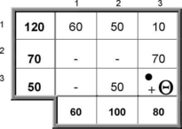 Переходим к проверке условий оптимальности (1). Достаточно проверять их для незаполненных клеток, так как для клеток заполненных эти условия выполняются как равенства. Для проверки берется незаполненная клетка, складываются соответствующие ей потенциалы (первый элемент строки и последний элемент столбца) и из них вычитается цена перевозки в данной клетке. Если полученное число отрицательное (или ноль), то оптимальность в данной клетке не нарушается (в случае выполнения условия (1) для всех незаполненных клеток, имеем оптимальный план перевозок). Если же в таблице встретилась хотя бы одна клетка, для которой это число положительно, тогда решение не является оптимальным и может быть улучшено.