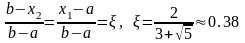 Как выгодно размещать точки? Всякий раз мы делим оставшийся отрезок на три части (причем одна из точек деления уже определена предыдущими вычислениями) и затем отбрасываем один из крайних отрезков. Очевидно, надо, чтобы следующий отрезок был поделен подобно предыдущему. Для этого должны выполняться соотношения
