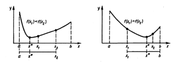 Затем в каждой из половин отрезка [а; с] и [с; b] выбираются по одной точке x1 и х2, в них вычисляются значения функций, производится сравнение полученных значений, и в результате сравнения устанавливается отрезок, в котором минимума быть не может. Откинув его, продолжаем ту же процедуру с полученным отрезком до тех пор, пока вновь полученный отрезок не станет меньше по длине некоторой наперед заданной величины: