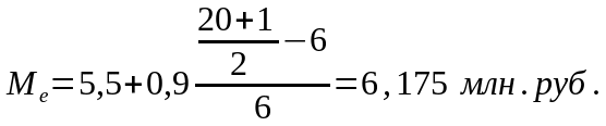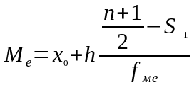 При определении медианы для интервальных рядов, вначале определяется медианный интервал, т.е. интервал, в котором лежит медиана. Он определяется также как и при определении медианы дискретного ряда, т.е. подсчитывают суммы накопленных частот.