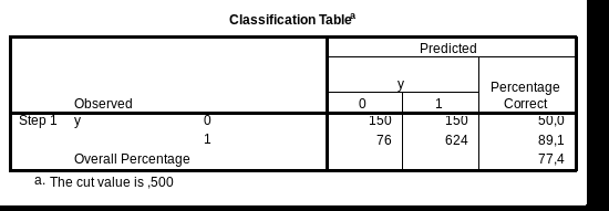 На основе модели логистической регрессии можно строить предсказание произойдет или не произойдет событие {Y=1}. Правило предсказания, по умолчанию заложенное в процедуру LOGISTIC REGRESSION устроено по следующему принципу: если
