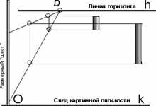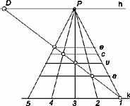 Этот удобный и часто используемый в практической перспективе прием был введен в 1693 г. итальянским художником Андреа Поццо. Прием состоит в следующем. На свободном месте картины, сбоку, зафиксировав на линии горизонта h произвольную точку D, до следа картинной плоскости k произвольную прямую OD (рис. 2).