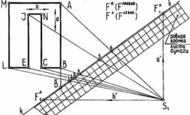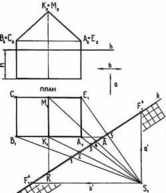 Известны фасад и план некоторого объекта (схемы домика). Заданы, также h, k и S1. Сначала на плане проводим следующие построения: 1) строим основания точек схода F1 и F2, доминирующих направлений объекта – прямых а и b; 2) проводим основания лучей, проецирующих опорные точки объекта, отмечаем их точки пересечения с основанием картины k; 3) вводим в картину «угол дома» А (АА1 || b) и «конек» К (КК1 || а). На картине использован известный нам прием – введение в плоскость картины вертикальных отрезков. Любой отрезок, расположенный в картине, изображается на ней в ее масштабе в натуральную величину, т. е. отрезки |КК| или |АА| получаем так: измеряем на фасаде, увеличиваем в два раза и откладываем на соответствующих вертикалях, заранее построенных на картине. Построив в перспективе хотя бы один угол зрения, например, вертикальный отрезок А-А1-F, находим в перспективе остальные точки в пересечении вертикалей, проходящих через соответствующе точки 1, 2, 3, …, с перспективами соответствующих прямых, сходящимися в точке F1 или F2.