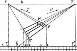 1) На следе картинной плоскости "к" находим основания точек 1, 2, 3, 6. 2) определяем точку В (рис.3,а). Переходим к построению перспективы на картине (рис. 3, б): 1) переносим с плана (в том же масштабе) точки картинный след к и все точки на нем. 2) через точки 1, 2, 3, … проводим прямые, перпендикулярные к основанию картины k, – на этих перпендикулярах расположатся искомые перспективы вершин плоской фигуры. Но где именно? Достаточно найти одну конкретную точку, а после этого мы используем точки схода F (слева и справа) b определим перспективы для других точек. Здесь нам поможет точка В – введенную в картину по направлению к точке В; 3) проводим прямую ВF и отмечаем на нем точки В и А – точки ее пересечения с перпендикулярами, проходящими через точки 4 и 6.