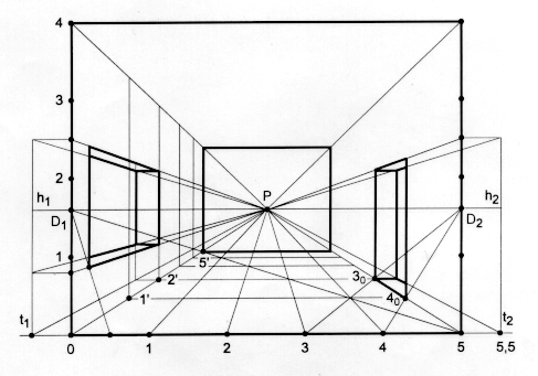 4. Из точек 0 и 5, взятых на масштабе широты, проводят прямые в точку Р. Расстояние между этими линиями, даст перспективу широты интерьера. 5. Для построения боковых стенок на одной из вертикальных границ картины складывают четыре единицы, равные четырем отрезкам на масштабе широт, и точку 4 соединяют с точкой Р. Расстояние между линиями 0-Р и 4-Р будет перспективой высоты интерьера. Аналогично строят и правую сторону. 6. Для построения глубины интерьера на масштабе широт берут пять единиц, соответствующие пяти метрам глубины интерьера (если глубина больше или меньше, то соответствующее расстояние), и из точки 5 проводят линию в дистанционную точку D1. Пересечение этой линии с линией 0Р даст глубину интерьера 5 м в перспективе. Из точки 5' проводят горизонтальную и вертикальную линии противоположной стены до пересечения с соответствующими линиями масштаба широт и высот (линиями схода). 7. Пользуясь перспективным масштабом, приступают к построению дверного проема правой стены (ширина двери равна 1 м, высота 2,5 м и удалена от картины на 1 м). Для этого из точки D2 проводят линии в точки 3, 4, взятые на масштабе широт и отмечают точки пересечения 3 и 4 на линии 5Р.