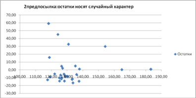 Из графика зависимости остатков εi от теоретических значений результативного признака видно, что точки распределены случайно, следовательно, εi представляют собой случайные величины и МНК оправдан.