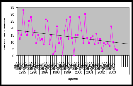Итого прогноз составит: январь-февраль 8 отк, март-апрель 7 отк, май-июнь 7 отк, июль-август 8 отк, сентябрь – октябрь 7, ноябрь-декабрь 6, для проверки метода произведем те же вычисления, но на 9 лет, и сравним результат с реальными данными