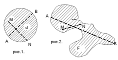 Сказанное выше наводит на мысль назвать диаметром фигуры наибольшее из расстояний между ее точками. Иначе говоря, диаметром фигуры F (рис. 2) называется такое расстояние d, что, во-первых, расстояние между любыми двумя точками М и N фигуры не превосходит d, и, во-вторых, можно отыскать в фигуре F хотя бы одну пару точек А, В, расстояние между которыми в точности равно d.