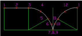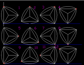 На фигуре 5 происходит смена траектории движения вершины. На фигурах 5, 6, 7 вершина движется по трохоиде точки, находящейся на поверхности окружности с радиусом, равным длине стороны треугольника. На фигурах 7, 8, 9 меченная вершина является точкой перевала треугольника, она жестко лежит на поверхности. Фигуры 9, 10, 11 – опять трохоида и 11, 12, 1 – движение по окружности. По аналогии эти фигуры описаны выше. Меченая вершина возвращается в исходную точку. Треугольник Рело совершил полный оборот.