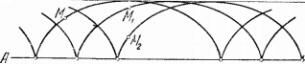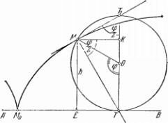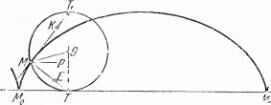 Теперь мы дадим определение циклоиды как геометрического места точек, не пользуясь механикой. Проще всего поступить так. Рассмотрим произвольную прямую АВ (будем условно считать ее направление горизонтальным) и на ней точку М0. Далее рассмотрим всевозможные круги определенного радиуса, касающиеся этой прямой и расположенные по одну сторону от нее. На каждом круге от точки Т касания его с прямой АВ отложим (в направлении к точке М0) дугу ТМ, по длине равную отрезку М0Т. Геометрическое место точек М (взятых на всех упомянутых нами кругах) и будет циклоидой.