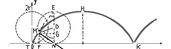 . Проведем МК||АВ и ME ┴ АВ. Отрезок МЕ будет играть в дальнейшем значительную роль, поэтому дадим ему имя и обозначение: будем называть его «высотою» точки М циклоиды и обозначать буквою h. Итак, высота точки М циклоиды — это расстояние ее от направляющей прямой.