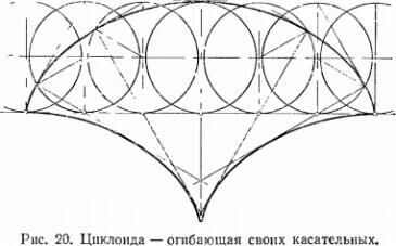 чем число делений будет больше, тем, как мы знаем, чертеж получится точнее. В каждой точке циклоиды, построенной нами, проведем касательную, соединяя точку кривой с «верхней» точкой производящего круга. На нашем чертеже получилось семь касательных (из них две — вертикальные). Проводя теперь циклоиду от руки, будем заботиться, чтобы она действительно касалась каждой из этих касательных: это значительно увеличит точность чертежа. При этом сама циклоида будет огибать все эти касательные 1).