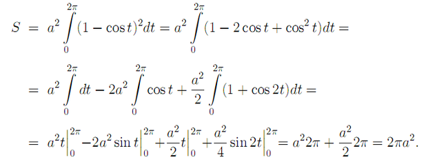 Исходя из приведенной выше теоремы, наша задача о нахождении площади фигуры, ограниченной одной аркой циклоиды, уравнение которой задано параметрические x= a (t – sin t) , y= a (1 – cos t) , и осью Ох, сводится к следующему решению.