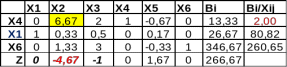 x1=26,67, x2=0, x3=0, x4=13,33, x5=0, x6=346,67, Z=266,67.