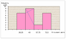 | Кількість вантажних автомобілів | Кількість АТП | Накопичена частота(f кум) | Середина інтервалу |