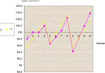 На графіку динамічного ряду видно що за звітний період обсяги м’ясних напівфабрикатів знизились. На графіку витрат на рекламу видно, що вирівняні значення Y дуже нагадують пряму тренду, також видно що витрати на рекламу значно зросли за звітний період. Найбільш варіюючою вийшла крива емпіричних значень, всі інші ближчі до прямої. Графіки індексів сезонності показують розбіжність яку дають різні способи обчислення (відношення емпіричного значення до середнього та відношення емпіричного значення до вирівняного).