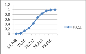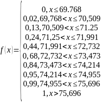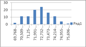 | Интервал | 69,768-70,509 | 70,509-71,25 | 71,25-71,991 | 71,991-72,732 | 72,732-73,473 | 73,473-74,214 | 74,214-74,955 | 74,955-75,696 | 75,696-76,437 |