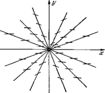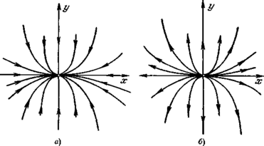 Таким образом, разбиение на траектории, определенное системой (40) (с указанными на траекториях направлениями *)[ Если особых линий нет, то для того, чтобы наметить направление на траекториях, достаточно наметить направление в какой-либо одной точке, тогда во всех других точках направление определяется из соображений непрерывности. Определить же направление в какой-либо точке х0, у0, в которой Р (х0, у0) =/= 0, можно, вычисляя в этой точке Р (х0, у0) и определяя в этой точке знак Р (х0, у0); если Р (х0, у0) >(), то в точке (х0, yQ) dx/dt > 0, а значит, вблизи этой точки при движении по траектории в сторону возрастания t x возрастает, что н определяет направлении на траектории, проходящей через точку (а;0, у0). Совершенно аналогично можно наметить направления на траекториях, рассматривая знак dyidt в точке, в которой Q {х0, у0) М 0. 2)]), имеет вид, указанный на рис. 10. Состояние равновесия такого типа называется узлом,устойчивым в случае a1 < 0, a2<0 (рис. 10, а) и неустойчивым в случае a1 >0, a2 >0 (рис.10,б).