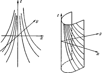 Рассмотрим интерпретацию в трехмерном пространстве. Как и в предыдущем примере, ось t является интегральной кривой системы (45) в пространстве (х, у, t). Остальные интегральные кривые расположены на цилиндрических поверхностях, имеющих своими направляющими спирали (48), а образующими — прямые, параллельные оси t. Эти интегральные кривые асимптотически приближаются к оси t при