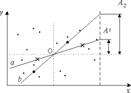 Таким образом, быстрая оценка коэффициента корреляции и значения относительной погрешности основывается на том, что прямые a и b обязательно проходят через точку пересечения границ О. При этом, чем выше разброс экспериментальных данных (невытянутая область), тем больше будет угол между прямыми a и b.