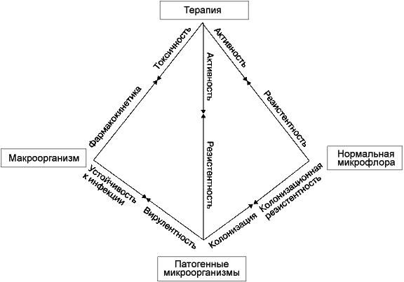 Антимикробная химиотерапия отличается от других видов фармакотерапии тем, что основывается не только на особенностях пациента и лекарственного препарата, но также и на характеристике инфекции. Наилучшим образом сложная система взаимоотношений между макроорганизмом, микроорганизмами и антимикробными препаратами отражена в пирамиде инфекционных болезней ( см.рисунок). В ней наглядно показаны множественные взаимодействия между пациентом, лекарством, патогенными микроорганизмами и нормальной микрофлорой.