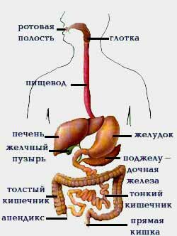 | Основные отделы пищеварительного канала: ротовая полость глотка пищевод желудок кишечник (подразделяется на тонкий кишечник и толстый кишечник), заканчивающийся анальным отверстием | Основные пищеварительные железы: слюнные железы (выделяют слизь и слюну) клетки желудка (выделяют желудочный сок, слизь и соляную кислоту) печень (выделяет желчь) пищеварительная часть поджелудочной железы (выделяет сок поджелудочной железы) клетки кишечника (выделяют слизь и кишечный сок) | |||